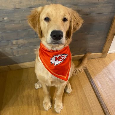 Bella is our medium golden. Bella has a calm, loving temperament. Bella weighs 68 pounds. She loves to fetch balls and sticks.